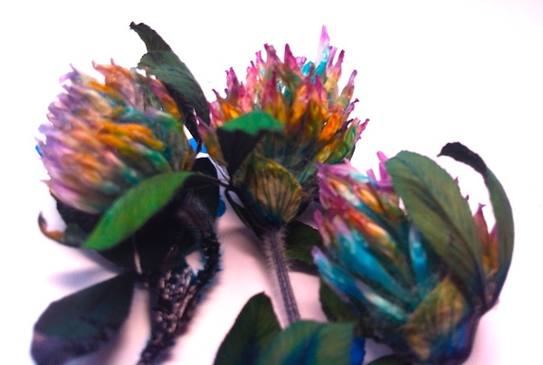 カラフルな花を咲かせた赤クローバーを作ってみました。草むらで積んだ赤クローバーを(ダイソーで買った)インクジェットプリンタの染料インクに活け、しばらくの間じっと待っていると、クローバーが水とインクを吸い上げ、花がカラフルに染まっていきます。(参考:染料インクで白い「鉄道花(ヒメジョン)」をカラフルに染めてみよう?