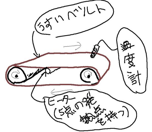 「エクセルでシミュレーション Vol.9 二次元非定常熱伝導問題の温度変化グラフも作ってみよう」で、二次元非定常熱伝導問題を解くシートを使いながら(実用的範囲では三次元問題と大差がない)、ヒーターで回転するベルトを高温にした場合の、その回転ベルトの温度分布がどのように変化していくかを計算し、グラフ化し、さらにベルト中の一部分の温度を時系列的にモニターする機能を付けた、シートで遊んでみました。