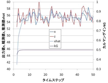 Ruby simpleKalman.rb 50 > simpleKalman.csvという風にCSVファイルにして、Excelで開き、結果を示したのが下のグラフです。観測ノイズがある中で(観測値が朱線で示したzです)、水色点線で示したxhat(この単純例では出力量の推定値)が、水色で示したx(この単純例では出力量)をそこそこ推定できているようです。