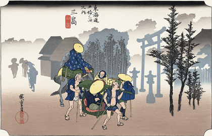 「古写真」と同じ場所で写真を撮って「タイムトリップ」してみませんか?というわけで、とりあえず、「明治末期」に行ってきました。行った時代が明治末期なら、行った場所は、東海道三島宿近くの三島大社です。歌川広重(安藤広重)が東海道五十三次の浮世絵「三島」(右隣の画像)に描いた「三島大社前」です。