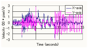 材料が揃ったところで、さっそくアダルトビデオの画面の中のモノたち(つまりは俳優達だ)がどんな風に動いているかを解析するソフトウェアを作ってみた。いや、もちろんアダルトビデオでなくても構わないし、もちろん男優と女優達でなくても構わないわけであるが、今日のお題は「アダルトビデオの科学」であるわけだから、アダルトビデオの中の俳優達が画面がどんな風に動いているのかを解析するソフトを作ってみたのである。そして、とりあえず各15秒のアダルトビデオ二本における横揺れ縦揺れ速度の変化を解析してみた結果がしたのグラフである。青い線が横方向の揺れの速度で、紫色の線が縦方向の速度になる。