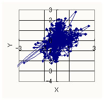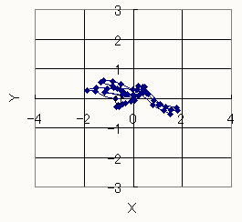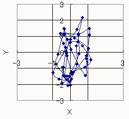 そんな縦と横の動きの関係がもう少し判りやすいように、サンプルビデオの画面平均速度をX-Y平面(「横方向速度-縦方向速度」平面)に描いたグラフを描いてみることにした。そうすると、縦の動きがあればX-Y平面内では縦に動くし、横の動きがやはりX-Y平面内で横にプロットが動くことになり、見て判りやすいグラフになる。まずは、15秒の間に各アダルトビデオの画面が一体どんな風に動いているか(揺れているか)をプロットしてみよう。