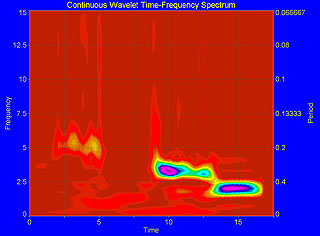 というわけで、下に示すグラフは横軸が約15秒間の時間を示している。そして、縦軸は生じている振動の周波数を示し、色はその周波数の信号の強度を示している。つまり、時間をおってどんな周期の振動が生じているかを示したグラフなのである。