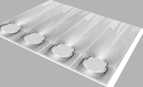 ![]() | 窓の外に手を出したときの、指の周りの空気の動きを時間を追って計算してみたもの。指の周りに空気が渦巻いていく様子がよくわかる。 メッシュを細かく切ったおかげで、計算結果は1GB弱。なんてこったい。 |