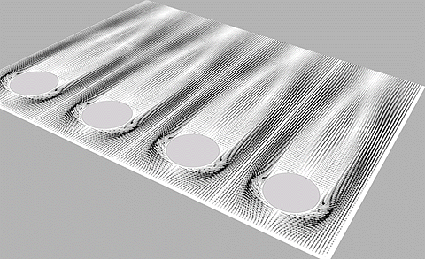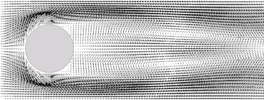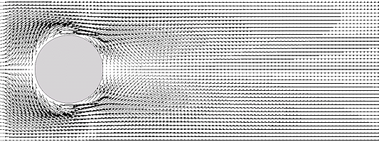 A : 「基本的には「加速度 = 外力 + 圧力勾配力」という形だな。この非圧縮・非粘性の理想流体の場合はラプラシアンがゼロのポテンシャル流れと呼ばれる単純な流れになる。試しに、そんな場合をNast2Dを元にしたプログラムで計算してみた結果はこんな感じになる。ホントはこの計算自体は完全な理想流体ではないのだが、まぁ大体はこんな感じだ。」