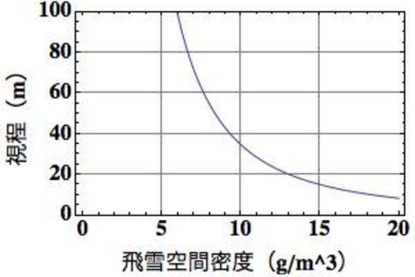 上式でとても興味深いのは、視界(視程)が「1立方メートルあたりに存在する雪の重量(飛雪空間密度)」と同じくらい「雪の速度」に影響を受ける、ということです。つまり、たとえば風速(雪を動かす風)が2倍増すと、あたかも目の前を舞う雪の量が2倍増えたのと同じ影響がある、ということになります。