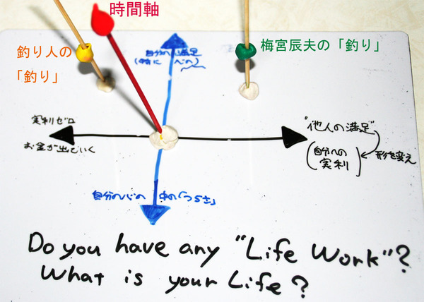 また、同じような作業であったとしても、その作業をする人によって、この空間での「座標」は異なってくることでしょう。それは、たとえば「梅宮辰夫の"釣り"」と「釣キチの"釣り"」が、その作業内容が同じようなのに、商品価値(黒い横軸)としては大きく違ってしまうようなことです。