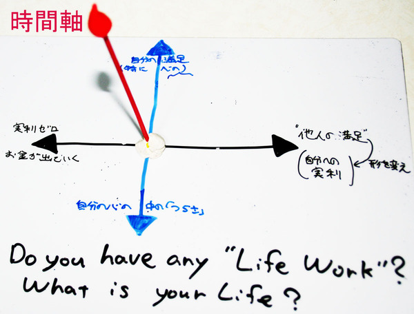 そして、もう一つ、「"自分(本人)の欲求・満足"と"他人の満足"という2軸で表される複素平面に、少なくとも"時間軸という軸を一つ増やしたい」とも強く思いました。私たちを大きく支配する軸でもあり、私たちにとって希少なものでもある"時間"という軸を増やしてみたいと、思ったのです。