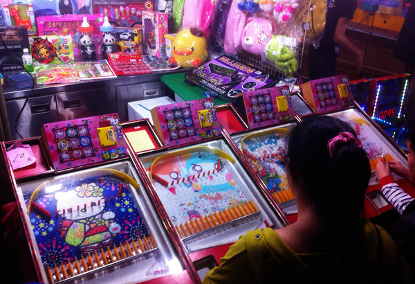 台北で夜市を眺めていると、射的や原始なパチンコのような掛け型ゲームが多くありました。その中で面白く感じたのが、原始時代なパチンコに「四目並べやビンゴ」が足されたようなゲームです。つまり、「パチンコで弾が落ちた場所(一番左端が1で、一番右橋が16です)の数字が一直線上を並びつくしたら勝ちになる」というゲームです。