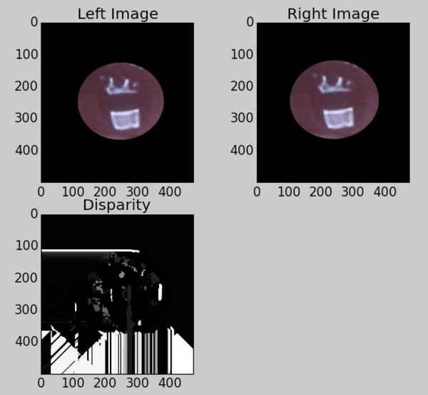 そこで、三原じゅん子さんの左右両目の瞳表面に反射して見える魚眼世界を、適当に歪み補正した上で、両眼視差から距離マップを復元しよう!としてみたのが下図に示す結果です。…残念ながら、今回は「それっぽい」世界を得ることができませんでした。