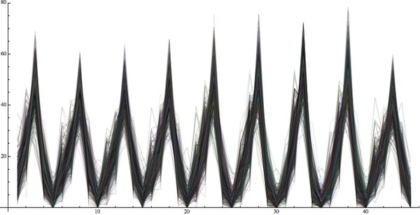 「都内公立中学校第3学年(平成25年12月31日現在)の評定状況の調査結果について」という東京都立中学の「(学校毎の)通信簿=学生評価の違い」が面白かったので、東京都立中学564校の評価結果をグラフにして眺めてみました。これは「国語・社会・数学・理科・音楽・美術…」を順番に、各学校ごとに評価5から1まで並べてみたものです。