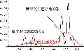それに対して、「ゆっくり」タイプの女の人であるB子の場合には、「恋の炎」がずいぶんとゆっくり燃え出している。また、「恋する心」の広がりが広い分だけ、「恋する心」の最大値も低くなっている。芸能人で言うと誰になるだあろうか?私にはちょっと思いつかない。