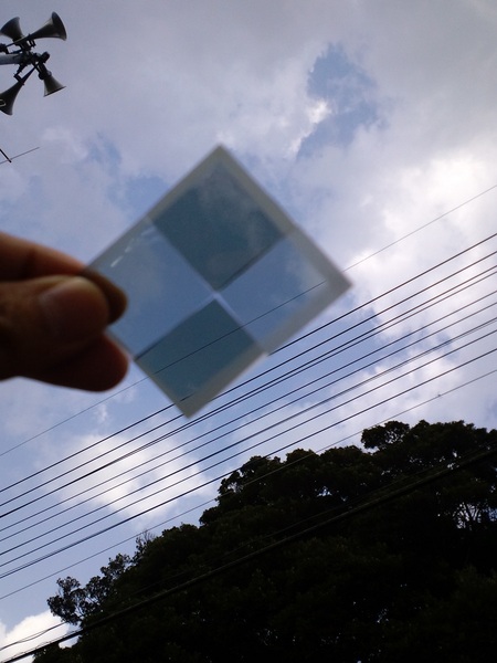だから、下の動画や右の写真のように、偏光版(の偏光方向)を直交するように配置して貼り合わせたものを作り、それを通して青空を眺めてみると、偏光の方向がとてもわかりやすいものです。貼り合わせ偏光版を回転させてみれば、隣り合う箇所の明暗が一番強くなる向きはすぐわかります。