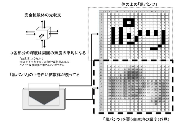 さて、体の上に「黒パンツ」があるとして(上図の右上部分)、その「黒パンツ」を覆う白生地が(外見上)どんな輝度に見えるかの計算結果を示したのが、上図の右下部分です。