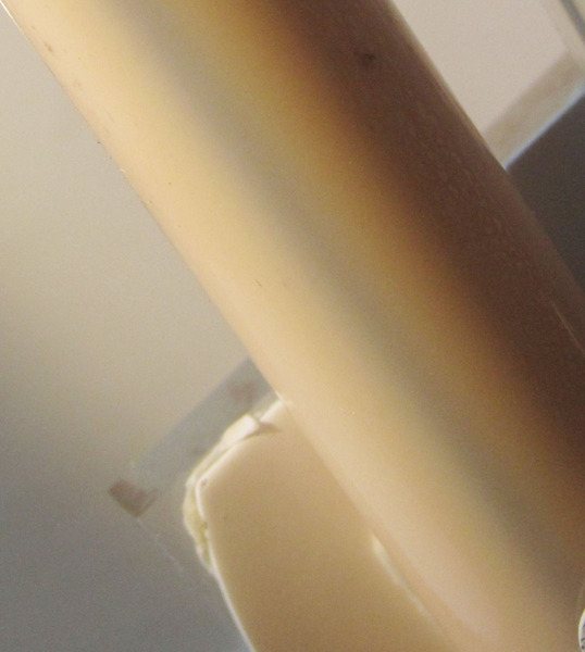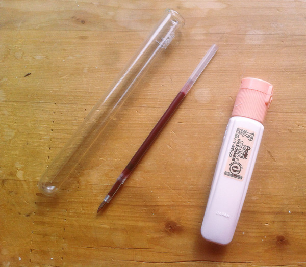 水に溶かした肌色絵の具を試験管に注ぎ入れ、その中に赤ボールペンの芯を入れてみます。赤ボールペンの芯は「脱酸素化ヘモグロビン*により暗赤色に見える静脈」を模しています。肌色の腕ならぬ肌色の(おそらく材料的にはミー散乱・レイリー散乱で模せる程度の)光拡散体に、暗赤色の静脈ならぬボールペンの芯を入れてみます。