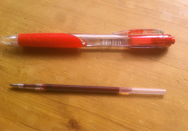 …というわけで、100円ショップで買った赤ボールペンと肌色絵の具、トータル200円ナリの体感実験をしてみました。