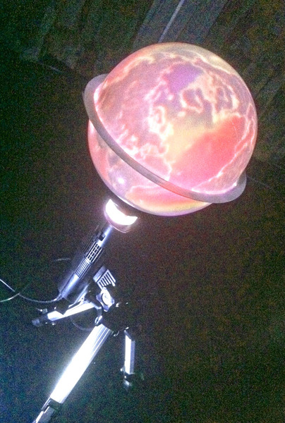 1万円少しで買った神田無線電機 Wis 高解像度小型プロジェクター KVD-Z240Kと、アキバのどこかの店頭で買った(多分)スマートフォン用の円形魚眼レンズ で、湯村さん @yumu19 のPersonal Cosmos モドキを作成中です。まずは、東急ハンズで160円くらい(だったような気がする)で透明半球樹脂を買い、100円ショップのダイソーで買った白色塗料スプレーで透明半球を拡散白色塗装して、とりあえず、半球状態でオバマ大統領や地球をを表示してみます。…これが結構立体的で意外なほど面白く 、全球ディスプレイ面白いぞ!と思ったりします。
