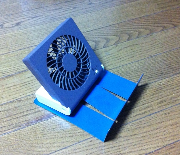 思い返してみれば、夏が近づき・気温が高くなってきた頃から、Macbook Airのノロノロ現象が始まったような気がします。…というわけで、コンパクトな扇風機を買い、そして(いつものように)百円ショップの本立てをグニュツと曲げて、ファン冷却機能付き「お手軽ノートPCスタンド」を作ってみました。
