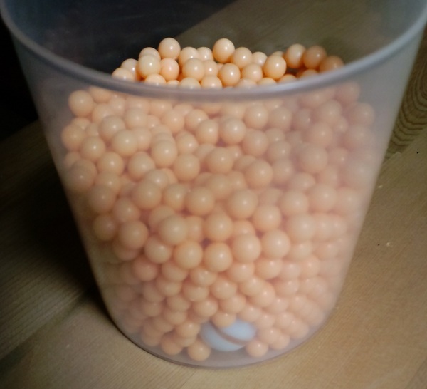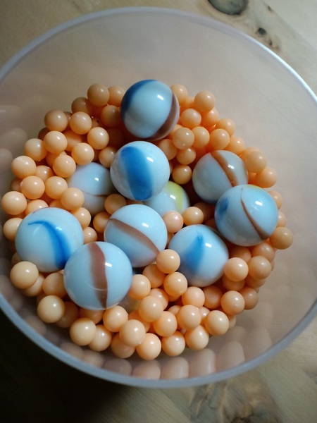 そこには、カップの中に詰まっているプラスチック製BB弾の上に、ビー玉が鎮座しているはずです(右の写真)。最初は下に沈んでいたはずの重いガラス製のビー玉が、軽いBB弾群の上に浮かんでいるさまを見ると、少し不思議に思えるかもしれません。けれど、これは身の回りの色々な「粒」を使って、簡単に確かめることができる現象です。