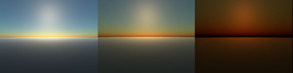 そこで、さらに調子に乗り、エアロゾルを「倍々ゲーム」で倍返しだ!(古い)という感じでさらに大気汚染の度合いを増やせば、もっともっと美しいはず!と「大気汚染が進んでいるという北京の夕日」をレンダリングしてみた。それが、一番右の景色です。