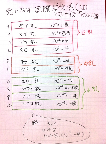 そこで、国際単位系の接頭辞を「イメージ的な巨乳順」に並べてみたのが右のラクガキ、題して『思い込みで描いた国際単位系(SI)巨乳単位ベスト10』です。…「一番巨大そうなのは、ギガ乳っぽい」とか千兆倍のペタ乳は「いたってフラット(平ら)そう」とか、真実一路の国際単位系認定の「(正真正銘の)微乳」は、10のマイナス6乗すなわち「一微倍」を指し示す、「マイクロ乳」だったのだな…と気づかされたりしたのです。
