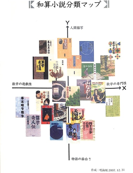 右下図は、本書冒頭に掲げられている「和算小説分類マップ」である。数学というX軸と人間・物語というY軸が形作る「和算小説平面」は、一見すると不可解に思われるかもしれないが、本書を読むと少し納得できると同時に、こういう散布図を冒頭頁に掲げる著者にとても興味を感じてしまう。