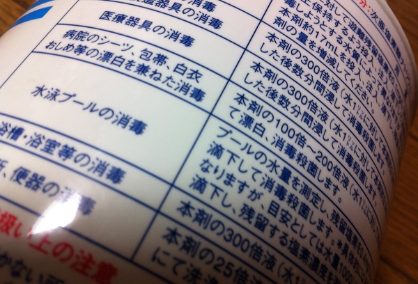 「水入れ替え」の回数を減らすには、学校のプールに塩素を入れていたように、プールの水に塩素を溶け込ませる次亜塩素酸ナトリウムを投入し、水を殺菌し続けることが重要です。…というわけで、薬局に行き、次亜塩素酸ナトリウムを主成分とする消毒剤を買ってきました。この消毒剤を定期的に(所要量だけ)ビニールプールに入れておけば、雑菌がプール中で繁殖するのを防ぐことができる、というわけです。