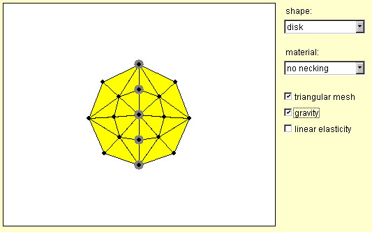ハイ、判りましたでしょうか?つまり、このElasticity Simulatorは「オッパイ・シミュレータ」に大変身するわけです。"material"を変えて、ヤング率を変えることで「堅いオッパイ」「柔らかいオッパイ」、「ヤングなオッパイ」「アダルトなオッパイ」などさまざまな物理実験をすることができるようになります。もちろん、無重力条件下とか動的特性なども眺めることができるのです。
