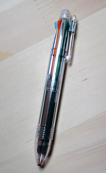 色々アイデアスケッチをしたりする時や他の人に何かを説明する時、多色ボールペンを使う。これまでは、四色ボールペンを使っていた。先日、文房具屋で「四色ボールペン+シャープペンシル(消しゴム付)」というクリップ-オン マルチ (1000)を見かけて思わず買ってしまった。これは便利だ。ただし、シャープペンシルが付いているのも便利ではあるが、(欲を言えば)他の色のボールペンとか修正ボールペンが装着された5色ボールペンなら、私自身の用途としてはさらに便利そうだ。