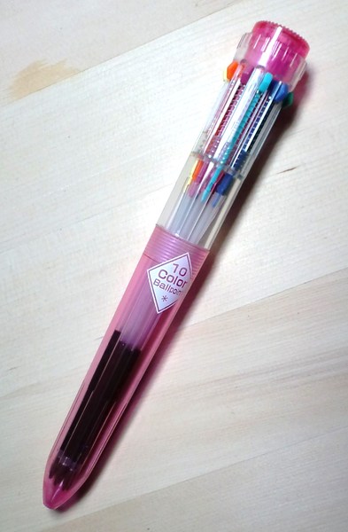 100円ショップのSeriaに行くと、「カラフル10色ボールペン(日本パール加工製)」を売っていた。「ペンの太さ」や「色の切り替えをするのにペン上部のボタンを押す必要がある」ということもあって、即時性が要求される常用ペンとして使うのは難しそうだが、100円という安さとカラフル10色というのは、とても魅力的である。そこで、試しに買って・(鞄の中に入れておく)2本目のボールペンとして使ってみることにした。
