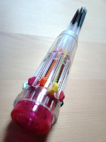 拡大して眺めてみると、なるほど確かに多色ボールペンの色芯が前後する時に、汚れることがない構造になっています。筒の内側には、何本もの(的確な曲率の)山谷が刻まれていて、ボールペンの芯が飛び出そうとする時には、まず芯の根元が山谷レールに触れ・レールに導かれ…そしてペン先端から芯が突き出すような構造になっています。