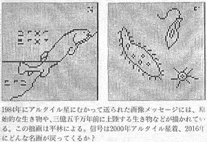 ところで、そんな風にベガとアルタイルをからかうためではないけれど、アルタイルにかつて地球からメールが出されたことがある。スタンフォードの46mのパラボラアンテナからアルタイルに向けて、13枚の画像が送り出された。その13枚の画像は本当に子供の落書きのような過去の生物の画や人間の姿が描かれていた。そんな子供心いっぱいの画像もあるかと思えば、差出人(平林・森本)が二人とも飲むのが大好きだったので、メッセージの最後はアルコール分子の組成式で締めくくられていた。本当に、ちょっと間違えるとベガとアルタイルをからかうヨッパライになってしまいそうである。