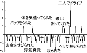 環境順応後の「恋する心」 = 本来の「恋する心」 + ( 良い印象)となる。なんと、「悪い印象」が「良い印象」にすり替わるのである。恐るべし、「環境順応」である。スイカに塩をかけると、ショッパイどころか逆に甘く感じられるのと同じく、ひどいD男がちょっとでも良いことをすると、「ものすごく良いこと」に感じられてしまうのである。前回、