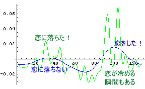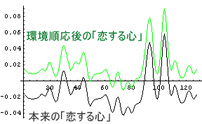さて、こういった環境順応した状態での、A子のC男に対する「恋する心」とD男に対する「恋する心」を眺めてみることにしよう。次のグラフは黒字がA子のC男に対する「恋する心」を示し、緑字がA子のD男に対する「恋する心」を示している。