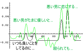 さて、その「恋する心」の「順応」を計算するにはどうしたら良いだろうか?そう、普段の印象を基準にすれば良いのだ。普段の印象、すなわち「印象の平均値」を「恋する心」から引けば良いのである。例えば、A子のC男に対する「恋する心」を計算してみることにする。次のグラフで黒字が「色々な出来事」と「恋のインパルス応答」の畳み込みであり、本来のあるべき「恋する心」である。そして、緑字が環境順応後、すなわち、本来のあるべき「恋する心」から「印象の平均値」を引いた「恋する心」である。