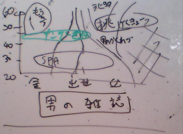 下の画像は、その時描いたホワイトボードのコピーの一枚である。横軸は「金・出世・女」の割合で、縦軸が年齢だ。SPA!・サンデー毎日・男の隠れ家・ラピュタといった雑誌名をこんな二次元マップ上に描いてみたわけである。