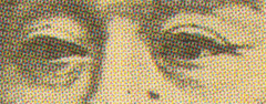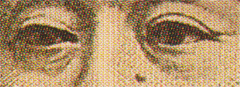 「一目瞭然だぁ。」という声も聞こえるが、結構よく出来ている「偽札」だとは思わないだろうか?よく出来すぎと言っても良いほどである。福沢諭吉の目の辺りの拡大写真を示してみる。