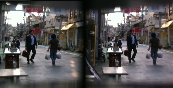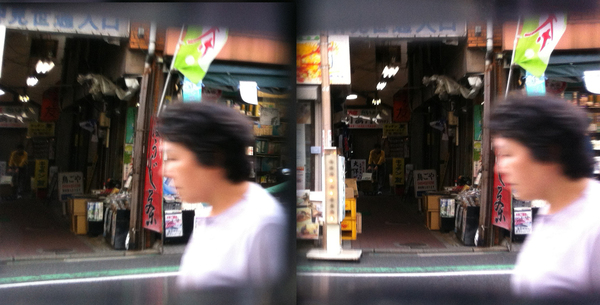 下の写真は、デイリーポータルZ・プレゼンツの(富士通研究所製)3D写真アダプタをiPhone4に取り付け撮影した、横浜六角橋商店街の写真です。