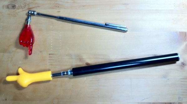 ちなみに、上にある差し棒は、「差し指」が(写真のように)曲がります。元々が、磁石を取り付けた先端部分が曲がるような”手が届かないところにある磁性体を拾うための”ピックアップツール(100円ショップで買いました)、の先に、「指」を取り付けてあるので、自由自在に「指さす部分」をクイックイッと曲げることができるのです。指さした先から実は180°逆!とか…そんなことができるのです。