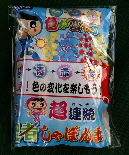 100円ショップのセリアで、「色が変わる 超連続 忍者シャボン玉」というものを買いました。パッケージには、(シャボン玉を吹くと)「虹色→青色→赤色→金色」に次々と色が変わっていくと書いてあります。