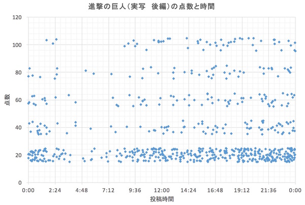 実写映画「進撃の巨人 ATTACK ON TITAN エンド オブ ザ ワールド」のYahoo!映画ユーザ・レビューの点数が低い。ふと、ユーザー投稿時間がレビュー点数に影響を与える可能性があるだろうか?と考えて、640人分のレビューを「投稿時間・点数」で散布図にしてみました。点数は20,40,60,100点という20点おきだったので、散布点が見やすいように点数に若干のランダムノイズを加えてみました。