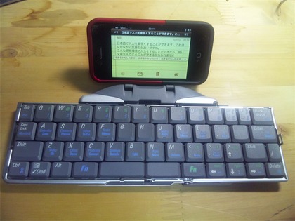 Bluetooth接続の「折り畳むととても小さいキーボード」"Thinkoutside stowaway universal Bluetooth keyboard"を借りて使ってみました。キートップの大きさ・キー間隔・そして押し心地なども、とても良い感じでした。デスクトップPC 用のキーボードなら、もっとハッキリとしたキータッチが良いような気がしますが、スマートフォンや携帯電話のキーボードとしては、ちょうど良い具合の押し心地で、実に自然に使うことができました。それはつまり、キーを押した音が出ず、柔らかなキータッチで、という具合です。