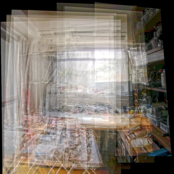 上記処理のコード手順、Python/OpenCVで書いたコード処理手順は、bundler.outからカメラ位置・方向・焦点距離や歪みパラメータを読み込み、cv2.initUndistortRectifyMapにカメラ情報を渡して、各撮影画像の向き補正用のホモグラフィーマップを作成してremapで変換した後に、各撮影画像を加算合成するという手順です。