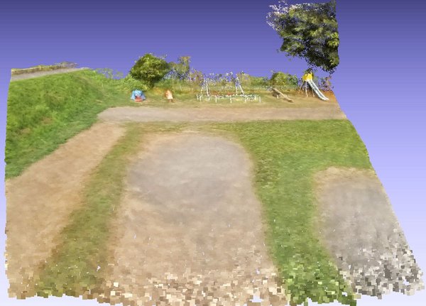 …というわけで、まずは撮影動画から3Dシーンを再構成してみました。風が吹く中のファーストフライトからの処理画像の割には悪くない感じかな?と思います。