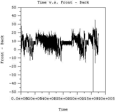 このようにコマの中に登場する主人公達の向きを数値化することにして、話の冒頭から結末までの各コマ中での主人公(周平)とその恋人(アキちゃん)の向きを調べてみたのが下のグラフである。青色の四角が主人公で、赤色の三角がヒロインである。また、その二人が向かい合ってる場合には朱色の丸を方向=0の位置に書き入れてみた。グラフ中では水平軸がストーリーの時系列で、左端が話の冒頭であり、右端が話の結末、そして縦軸が「主人公達の向かう方向」である。また、ヒロインのアキちゃんが途中の2カ所にしか現れないのは少しばかり悲しいストーリーのせいだ。この「霜ばしら」は主人公とアキちゃんの涙を誘う悲しい物語なのである。