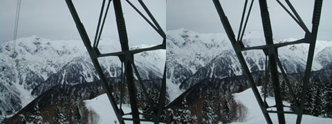 交差法です。遠くを眺める要領で、新穂高ロープウェイスキー場「だましの棚」の終わり、第三鉄塔の下からの景色を眺めてみて下さいな。それにしても、このスキー場がなくなるなんて…。