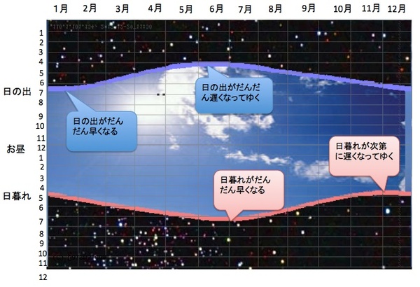 「明日(12月21日)は冬至。一年で一番”昼間”の時間が短い日です。けれど、決して日の出が一番遅い日でも・日の入りが一番早い日でもありません。日の入りが一番早いのは、今回の場合は12月5日、日の出が一番遅いのは2013年1月7日です。 図にするとこんな感じ」…というtweetが面白かった=興味深かったので、一年間にわたる「昼と夜」を図示してみました。