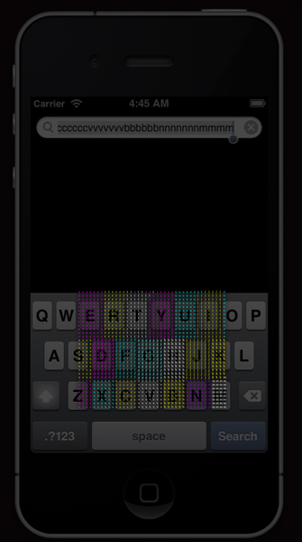 その結果、つまりiOS Emulator上でのキー領域分割状況、が下に貼り付けた画像です。 少なくとも、iOSエミュレータ上では、いたって普通の「矩形」分割がなされていました。