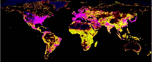 世界地図の中に散らばるそんな地域を目の前に浮かび上がらせるために、最初の画像「人工衛星から撮影された地球の夜景」と「世界の人口密度分布」の二枚の画像を利用して、画像解析により「人口密度に対する夜の街の灯の明るさ」を算出してみた。それが下に示した画像だ。ここで、黄色で示した地域は「人口密度の割に夜の街の灯はとても暗い地域」で、紫色で示した地域は「人口密度は高く、夜の街の灯も輝いている地域」である。