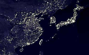 そう、朝鮮半島が何だか少しヘンなのである。韓国と中国の灯に挟まれた辺り、つまりは北朝鮮が真っ暗なのだ。「光り輝く」「偉大なる首領様」のいる国とは思えないくらいに真っ暗なのである。ワタシは「偉大なる首領様」はてっきり無意味に飾ることが大好きなのかと思っていたが、どうやら東京電力のでんこちゃん並に省エネ・電気の節約に励んでいるのだろう。北朝鮮は省エネ先進国だったのである。あるいは、もしかしたら北朝鮮は中国の奥地並みに人口密度がとても低く、街なんかほとんどなくて、だから夜の街の灯なんか無いだけなのかもしれない。